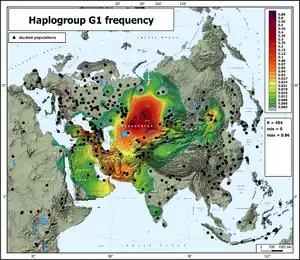 G1 (M285, M342) Se encuentra especialmente en Kazajistán con diversos porcentajes y en Irán con 5 % al Sur y 3 % al Norte.[11] Poco en el Levante y resto del Medio Oriente.