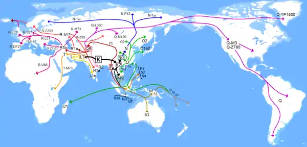 La población originaria se habría establecido primero en el sudeste de Asia, ya que esta región constituye su centro de expansión.[5] A través del haplogrupo MS coloniza toda Oceanía (conjuntamente con C), mediante el haplogrupo O domina absolutamente el Extremo Oriente, por expansión del haplogrupo R conquista Europa y el subcontinente indio, por migración del haplogrupo Q coloniza América y con el haplogrupo N todo el norte de Eurasia. K-M9 se encontró, además, donde menos se esperaba, en tres individuos guanches prehispánicos de Gran Canaria, en las antípodas de donde es típico o predominante.