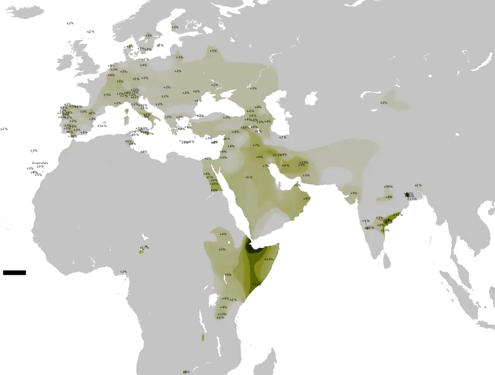- T1a1a2 (Y16897): En el Cercano Oriente, Europa y Cuerno de África.[3]
