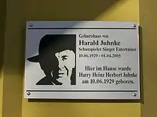 - Esta obra contiene una traducción derivada de «Harald Juhnke» de Wikipedia en alemán, publicada por sus editores bajo la Licencia de documentación libre de GNU y la Licencia Creative Commons Atribución-CompartirIgual 3.0 Unported.