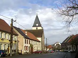 ![]() La calle de Fénétrange de Harskirchen, con la torre de la iglesia de San Nicolás.