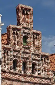 - Schoone-Jongen, Terence (2008). The Dutch American Identity. Cambria Press. p. 155. ISBN 978-1-60497-565-9. «In some towns—including Holland, Michigan–buildings were built with the distinctive Dutch step-gabled (trapgeveled) fronts. »