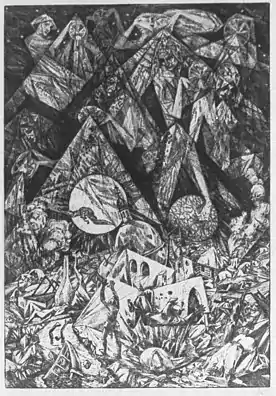 Pero la era estalinista también se cobró sus víctimas entre los vecinos de Vogeler, quienes fueron detenidos por la policía estatal y desaparecidos. Como yerno del revolucionario Marchlewski, él mismo no se vio afectado por la persecución. Así que adoptó una actitud de lealtad al partido, pero se cuidó de los delatores. Vogeler solicitó varias veces su reincorporación al KPD. Cuando eso no funcionó, trató de convertirse en miembro del Partido Comunista Soviético, pero fue en vano.[29] Sin embargo, sus esperanzas de encontrar el mundo mejor que anhelaba en la Unión Soviética se desvanecieron. Para evitar las acusaciones de que su arte era todavía demasiado burgués, abandonó el complejo estilo pictórico que había desarrollado desde 1934. Tuvo que adaptarse a la tosca forma de expresión del realismo socialista prescrita por el Estado. Destruyó algunas de las pinturas con imágenes complejas creadas durante este período o las transformó en imágenes realistas.