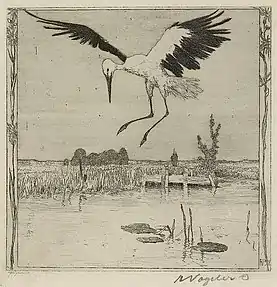 Otro enfoque fueron las obras gráficas de Vogeler, que establecieron su reputación como artista Art Nouveau. Los grabados románticos entre 1895 y 1899, como Cigüeña sobre el estanque de 1899 y las ilustraciones de La campana hundida de Gerhart Hauptmann, fueron muy bien recibidos en el país y en el extranjero. El grabado, o “pintura social”, como él lo llamó, se hizo muy popular entre las clases cultas debido a su uso generalizado.