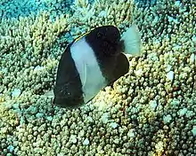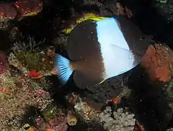 Su coloración base es marrón oscuro a negro, con una ancha franja vertical, blanca, que atraviesa el cuerpo ensanchándose hacia el vientre. Las aletas pectorales y la caudal son blancas. Las espinas de la aleta dorsal que coinciden en la franja blanca del cuerpo, son amarillas.