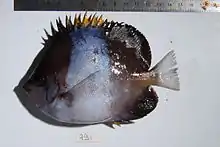 Tiene 12 espinas dorsales, entre 24 y 26 radios blandos dorsales, 3 espinas anales y 21 radios blandos anales.[3]