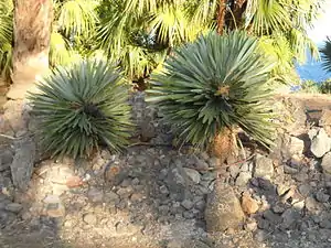 Palma de tronco grisáceo de unos 5 cm de diámetro cuyo ápice está formado por una corona esférica y muy densa de puntiagudas hojas rígidas, prácticamente carentes de tallo, de color verde.