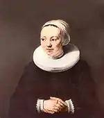- Retrato de matrimonio de su esposa Adriaantje Hollaer, pintado por el taller de Rembrandt, aproximadamente al mismo tiempo y considerado pareja del hombre del sombrero.