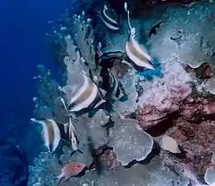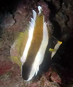 El pez estandarte de tres bandas (Heniochus chrysostomus), es un pez marino, de la familia de los Chaetodontidae.