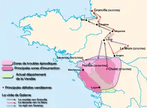 La Rochejaquelein dividió su ejército en tres cuerpos. Tomaron Ernée el 2 de noviembre y Fougères el día 3 en rápidos ataques consecutivos. A continuación, los vandeanos tomaron rumbo a Dol-de-Bretagne, alejándose definitivamente de Rennes. La Rochejaquelein siguió hacia Pontorson y Avranches, con el puerto de Granville como objetivo final. Con el grueso de la tropa, unos 30.000 hombres, atacó sin éxito el 14 de noviembre.[5] Las fortificaciones demostraron ser demasiado fuertes y la guarnición republicana muy numerosa y motivada. Los vandeanos quedaron completamente desmoralizados y casi se levantaron contra sus líderes exigiendo volver a sus hogares.