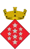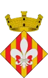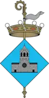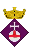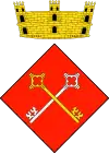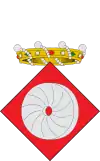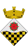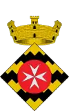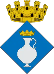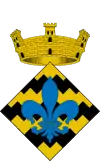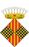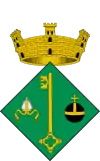 «De azur, dos llaves pasadas en aspa, con los dientes arriba y mirando hacia fuera, la de oro en banda sobre la de plata en barra, surmontadas en un bezante de oro cargado de un boj arrancado de sinople. Al timbre, corona de marqués.» Blasón aprobado el 1 de junio de 1983. DOGC n.º 342 de 6 de julio de 1983.[16] |
