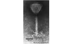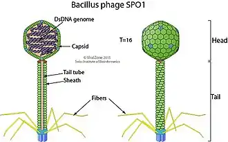 Los viriones tienen cápsides icosaédricas de 85–100 nm de diámetro. Las cápsides muestran capsómeros claros, es decir, las subunidades de la cápside están dispuestas en pentones y hexones que se ensamblan en la cápside icosaédrica. Las colas no contraídas tienen una longitud de 130-185 nm. Las colas tienen una placa base de aproximadamente 60 nm y un collar pequeño. Carecen de envoltura vírica. Las cápsides pueden albergar un máximo de 35 proteínas.[2][4][3]