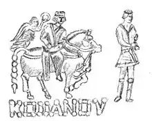 Rev: Montado a caballo, el jefe es coronado por la diosa griega Niké. Leyenda en griego: ΤΥΡΑΝΝΟΥΟΤΟΣ ΗΛΟΥ - ΣΑΝΑΒ - ΚΟϷϷΑΝΟΥ; "El tirano Hereo, sanav (significado desconocido) de los kushán".