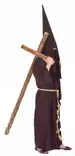 Túnica y capuz de tergal en color marrón carmelita, con cíngulo de pita con nudos alternados. Cubren sus pies con sandalias marrones sin calcetines.