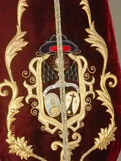 Antifaz, cíngulo y botonadura burdeos Túnica y capa color crema | |