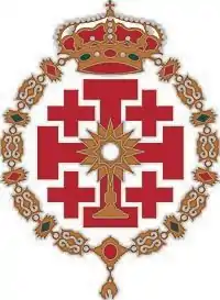 Por lo que respecta a los símbolos externos de la cofradía, el escudo corporativo siempre ha sido la Cruz de Jerusalén o del Santo Sepulcro en Gules, timbrada con corona Real y orlada con Toisón de oro. Tras la fusión de 1987 se incorpora la Custodia sobre el todo.