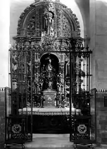 De entre las custodias procesionales que ha poseído a lo largo de su existencia, destaca la donada por la reina doña Isabel II , el día 18 de abril de 1861. Consta de basamento, de planta cuadrada, decorado con arabescos de estilo ojival y sobre los ángulos hay estatuas. El primer cuerpo es un templete con arcos ojivos, lobulados y columnas robustas, en los ingresos; en los ángulos también hay robustos fustes que llegan hasta la sencilla cornisa, de cuyos ángulos destacan racimos de uvas. En el interior colocan la custodia de manos con sol radiado. El segundo cuerpo contiene, en su interior, la estatua de la Inmaculada, y su exterior se compone de ingresos que rematan en gablete, flanqueados por contrafuertes con caperuza o aguja y delante de ellos hay imaginería; corona este último cuerpo una aguja o chapitel piramidal, y sobre él una cruz. Está inspirada en el estilo ojival. En los ángulos ponen candelabros de brazos, con tulipas de cristal. Es de metal plateado, y costó 6,250 pesetas. Esta custodia procesionó por la ciudad hasta 1930, ya que la II República prohibió este tipo de actos. Durante la Guerra Civil en 1936 fue destruida, pero pudo recuperarse gran parte de los restos.[3]