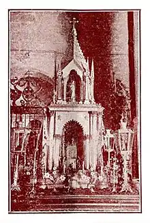 En el frontal del paso procesional y sobre el escudo de la hermandad, un ostensorio porta la reliquia de san Manuel González García, arcipreste de Huelva y párroco de San Pedro desde 1905 a 1916.