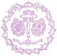 El escudo heráldico de la hermandad se encuentra presidido por las cinco cruces de Jerusalén en color negro, estando formada la principal por una cruz latina arbórea, flanqueadas por dos cartelas en campo de oro. En la cartela diestra figura el anagrama JHS y en la siniestra dividida en dos partes iguales, el anagrama de María en la parte superior y una nao española del siglo XVI en la parte inferior. Todo ello descansa sobre una orla en campo violeta con la leyenda «Oración, Penitencia, Caridad»; y bajo la citada orla los tres clavos pasionales de Cristo. Rodeando todo lo anteriormente descrito una corona de espinasen su color natural. Habitualmente el escudo se utiliza de color con tonos morados.