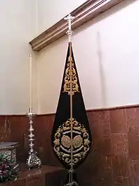 El estandarte, confeccionado por los talleres de bordado de José Antonio Grande de León, está formado por una bandera granate de terciopelo portada en un asta plateada, de Orfebrería Hermanos Fernández, rematada en Cruz, con el escudo de la hermandad bordado en oro y sedas de colores y cruzado de arriba abajo por un cordón trenzado dorado. La Cruz de Guía es una sencilla cruz latina de madera en tonos caoba con asas de orfebrería plateada. También de orfebrería son las ráfagas que aparecen cantonando la cruz y el I. N. R. I. En el Libro de Reglas aparece el escudo de la hermandad en orfebrería plateada. Las esquinas, el cierre y el lomo son exornados con piezas de orfebrería plateada, todo del taller de Orfebrería Hermanos Fernández.