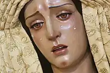 La Virgen del Amor es una talla de candelero realizada por Fernando Castejón en el año 1994 en madera de cedro. Policromada al óleo, mide 1,65 m. Nos presenta a María como una mujer joven, bella y de tez morena; cumpliendo perfectamente con la tipología de la dolorosa castiza sevillana. Su cabeza se inclina levemente hacia la derecha acentuando su expresión de sufrimiento y angustia aunque no exenta de dulzura; es una pena que parece nacer del más profundo amor por su hijo. Su boca entreabierta en la que se adivinan algunos dientes parece estar murmurando, lo que refuerza la sensación de estar ensimismada en su dolor, ajena casi a lo que ocurra a su alrededor. De sus ojos color miel caen cinco lágrimas, ajustándose a la iconografía clásica sevillana.