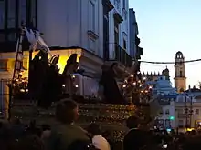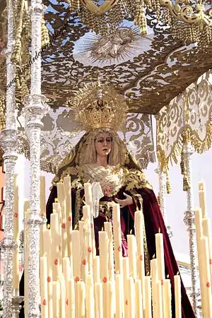 Santísimo Cristo de la Caridad Traslado de Cristo al Sepulcro. El Cristo es obra de Antonio Eslava Rubio[2] y fue bendecido el 5 de noviembre de 1962. Madre de Dios del Patrocinio. Madre de Dios del Patrocinio. Imagen de talla completa de estilo sevillano. Francisco Pinto Berraquero. Bendecida el 15 de noviembre de 1959. Reseña histórica El 8 de diciembre de 1958 por iniciativa del gremio de la hostelería, se constituyó la comisión organizadora de esta Hermandad del Santo Cristo de la Caridad y María Santísima Madre de Dios del Patrocinio. El 22 de julio de 1960, son aprobadas sus primeras Reglas por las que se regirá la Hermandad. Salió por primera vez en Sábado Santo, con un solo paso de misterio donde procesionaba la imagen de la Virgen y al fondo una cruz de la que colgaba un sudario. Actualmente, y desde 1981, procesiona en miércoles Santo. En el año 1966, la imagen de Madre de Dios del Patrocinio procesionó en paso de palio, siendo colocada en el paso de misterio María Santísima de Penas y Lágrimas. Desde el año 1997, realiza su salida procesional desde su casa de hermandad, muy cerca de la parroquia de San Mateo. Paso del Cristo de la Caridad. Foto: Fernández Lira deatlle de las imágenes del paso del Cristo de la Caridad. Foto: Fernández Lira Paso de Misterio El paso de misterio se le compró a la Hermandad de San Benito, de Sevilla, en el año 1966. La hermandad sevillana lo había estrenado en el 45; la talla es de José Gallego y el dorado de Herrera y Feria. El misterio lo componen nueve imágenes; todas son de talla completa del carmonense Antonio Eslava Rubio. El titular, el Cristo de la Caridad, fue bendecido en el año 1962. La Virgen y el San Juan fueron bendecidos en febrero del año 1963. Los dos Santos Varones llevan el cuerpo del Señor, y la Magdalena, Santa Marta y María Salomé caminan junto a ellos. Cierra la comitiva la Virgen, San Juan y María la de los Zebedeos. Paso de Palio La Dolorosa “Madre de Dios del Patrocinio” es una imagen de talla completa, obra de Francisco Pinto Berraquero y fue bendecida en noviembre del año 1959. Esta imagen procesionó desde 1960 al 65 en un paso de misterio. Cuando salió el misterio del Traslado al Sepulcro, en el año 66, la Virgen del Patrocinio comenzó a procesionar en una paso de palio. Los respiraderos los repujó Manuel Rodríguez para la Hermandad de la Soledad y fueron comprados a la Hermandad de la Soledad. Los candelabros de cola son de Jesús Rodríguez. El resto de las piezas son del Taller Viuda de Villarreal. Todo es de plata cofradiera. El techo del palio es de malla y bordado por Fernández y Enríquez. Las caídas son de José Antonio Cachero. El manto de terciopelo, color burdeos, lo comenzó a bordar Fernández y Enríquez en los años ochenta. Está sin terminar. En el año 2015 nace el taller de bordados de la Hermandad bajo dirección de D.Eusebio Romero Ibáñez estrenándose ese mismo año un manto de camerin rojo con bordados en oro para Madre de Dios del Patrocinio y un manto de salida en color negro y bordados en oro para Penas y Lágrimas de María Santísima, En el 2.016 estrenan dos túnicas una para Santa Marta en blanco y oro, una en marrón y oro para San Nicodemo y una saya negra y oro para Penas y Lágrimas de María Santísima más ocho mantolines en diversos colores.. En 2017 estrenan túnicas San Juan Evangelista en terciopelo verde y bordada en oro. María Magdalena en color buganvilla y bordados en oro, María Cleofas en color mostaza bordados en oro y María Salomé en color azul con bordados en oro. En el proyecto del taller esta terminar por completo tanto el misterio como el palio.