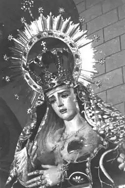 Es una Virgen dolorosa del imaginero sevillano Antonio Castillo Lastrucci realizada el año 1939. Es una Imagen moderna que sustituyó a la anterior del Siglo XVII destruida en la Guerra Civil. Posee un extenso patrimonio de gran valor. Procesiona con el manto antes mencionado de terciopelo negro bordado en seda blanca y pedrería con motivos florales y presenta el escudo de la Cofradía en la trasera. Aparte de éste, también posee otro manto procesional de terciopelo azul sin bordar, y de dimensiones superiores al anterior, dicho manto es lucido por la Virgen durante su Besamanos. El día de la Procesión va coronada con una corona de plata dorada, lapislázuli y pedrería, y suele llevar diversas joyas de gran valor.
