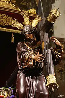 El paso de Cristo es de estilo neobarroco, dorado e iluminado por candelabros de guardabrisas. El ángel que soporta la caída de la cruz se hizo en 1995. El Señor lleva potencias de oro realizada en 1950.