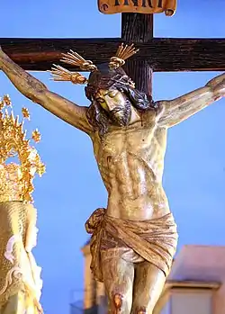 Obra anónima adquirida en Sevilla en el año 1972, no tiene ni datación ni se le vincula a ningún autor. Se trata de un crucificado de proporciones naturales, clavado a la cruz con tres clavos. Destaca un interesante sudario anudado en su lado derecho. Su cabeza, que cae hacia su lado derecho, porta las tres Potencias típicas de las imágenes cristíferas, las cuales fueron realizadas por Raquel Serrano Roldan en 1999.