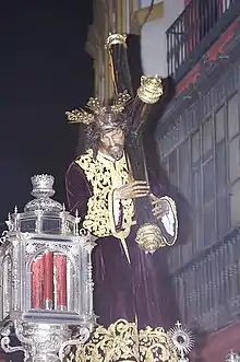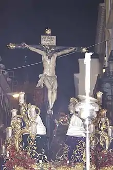 El paso es de estilo neobarroco, en plata de ley, realizado en el Taller de Viuda de Villarreal desde 1977 hasta el año 2000. Está iluminado por cuatro faroles plateados (realizados por Antonio Sandarán en 1913). El Señor lleva potencias flordelisadas, en plata sobredorada, realizadas en 1698. La cruz procesional fue obra del tallista Manuel Guzmán Bejarano en 1977.