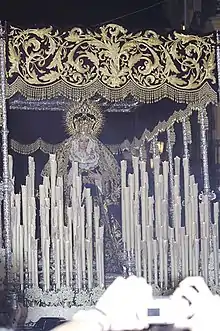 El paso es de estilo neobarroco, dorado e iluminado por seis candelabros de guardabrisas. Fue realizado en 1881 por Ricardo Reguera, basándose en un diseño de Joaquín Díaz Montero. Hay cuatro ángeles, cada uno en una esquina, de 1923. Lleva faldones de damasco rojo con cenefa bordada en oro realizados por Fernández y Enríquez en 2009.[11]