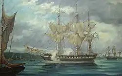 ![]() Óleo de la fragata Heronía en Puerto Soledad durante la toma de posesión argentina de las islas Malvinas, realizado por E. Biggeri. | ||