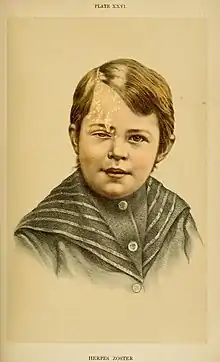 La descripción del herpes zóster está presente en los textos médicos desde hace mucho tiempo, pero estos relatos históricos no distinguen la formación de ampollas causadas por el virus varicela-zóster (VVZ) y las causadas por la viruela, ergotismo y erisipela.[12] No fue hasta finales del siglo XVIII cuando William Heberden estableció una forma de diferenciar entre el herpes zóster y la viruela, y a finales del siglo XIX se distinguió de la erisipela.[13] En 1831, Richard Bright sostuvo la hipótesis de que la enfermedad surgía del ganglio de la raíz dorsal, lo cual fue confirmado por Felix von Bärunsprung en 1861.[14]