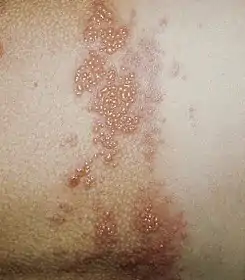 El herpes zóster[1] es una enfermedad producida por una reactivación del virus latente varicela-zóster, que afecta a los nervios periféricos —neuropatía gangliorradicular—[2] y a la piel, donde puede producir pequeñas ampollas dolorosas en forma de anillo agrupadas a lo largo de un dermatoma. Coloquialmente, es conocido como culebrilla, culebrina o culebrón. En algunas zonas del Mediterráneo, como en España y en Italia, también se le denomina «fuego de San Antonio».[3][4][nota 1]