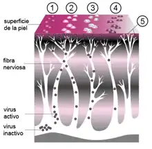 La mayor parte de las personas toman contacto con el VVZ durante la infancia, aunque no siempre desarrollen la sintomatología de la varicela —cuadro subclínico—. Durante la infección primaria, el virus pasa a los nervios sensitivos y se extiende hasta las fibras sensitivas de los ganglios nerviosos. Cuando el sistema inmunitario controla la infección, el virus permanece latente en los ganglios de la raíz dorsal de la médula espinal, el ganglio de Gasser del trigémino u otros de los pares craneales en la cabeza. Al parecer puede permanecer allí de por vida, aunque no se sabe con certeza si es en las neuronas, en las células de glía o en ambas. El virus inactivo no causa daño y no se multiplica, aunque puede volver a ser infeccioso.[7]