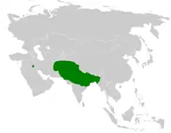 Su rango de distribución abarca una amplia franja al sur de la cordillera del Himalaya desde Irak hasta el oeste de Birmania, faltando en casi todo Irán. Ha sido introducida en numerosas islas y regiones continentales del Caribe, Cuba, Puerto Rico, Bosnia y Herzegovina, Croacia, Fiyi, Hawái, Japón, Mauricio y Tanzania.[2]