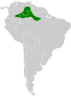 Se distribuye en el sur de Venezuela (oeste y sur de Bolívar, Amazonas), este de Colombia (este de Guainía, este de Vaupés, este de Caquetá) y noroeste de la Amazonia brasileña (hacia el este hasta el río Trombetas en el noroeste de Pará).[5]