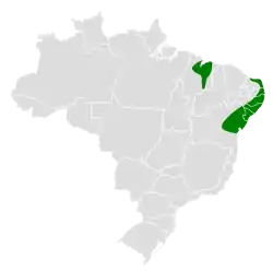 Se distribuye por el noreste de Brasil localmente desde el noreste de Maranhão hacia el este hasta Río Grande do Norte, hacia el sur hasta Sergipe y noreste de Bahía.[4]