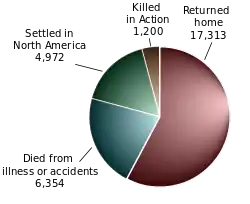 Cerca de 30 000 hessianos sirvieron en Norteamérica y tras el final de la guerra en 1783, 17 313 soldados hessianos regresaron a sus hogares en Alemania. De los 12 526 que no volvieron, unos 7700 habían muerto: en torno a 1200 murieron en combate y 6354 fallecieron por enfermedad o accidentes, sobre todo por la primera causa.[2] Aproximadamente 5000 hessianos se asentaron en Norteamérica, tanto en Estados Unidos como en Canadá.