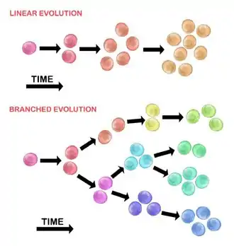 Las mutaciones ordenadas secuencialmente se acumulan en genes impulsores, genes supresores de tumores y enzimas reparadoras del ADN, lo que resulta en la expansión clonal de las células tumorales. Es menos probable que la expansión lineal refleje el criterio de valoración de un tumor maligno[30] porque la acumulación de mutaciones es estocástica en los tumores heterogéneos.