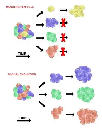 El modelo de evolución clonal fue propuesto por primera vez en 1976 por Peter Nowell.[27] En este modelo, los tumores surgen de una sola célula mutada, acumulando mutaciones adicionales a medida que avanza. Estos cambios dan lugar a subpoblaciones adicionales, y cada una de estas subpoblaciones tiene la capacidad de dividirse y mutar aún más. Esta heterogeneidad puede dar lugar a subclones que posean una ventaja evolutiva sobre los demás dentro del entorno del tumor, y estos subclones pueden llegar a ser dominantes en el tumor con el tiempo.[28][29] Cuando se propuso, este modelo permitió comprender el crecimiento tumoral, el fracaso del tratamiento y la agresión tumoral que se produce durante el proceso natural de formación del tumor.