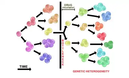 La administración de fármacos en tumores heterogéneos rara vez destruirá todas las células tumorales. La población tumoral heterogénea inicial puede producir un cuello de botella, de modo que sobrevivirán pocas células resistentes a los fármacos (si las hay). Esto permite que las poblaciones de tumores resistentes se repliquen y desarrollen un nuevo tumor a través del mecanismo de evolución ramificada (ver más arriba). El tumor repoblado resultante es heterogéneo y resistente al tratamiento farmacológico inicial utilizado. El tumor repoblado también puede regresar de una manera más agresiva.