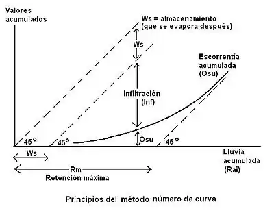 Normalmente se tiene que Ws = 0.2 Rm y el valor de Rm depende de las características del suelo. El método del Número de Curva provee cuadros para determinar esta relación.
