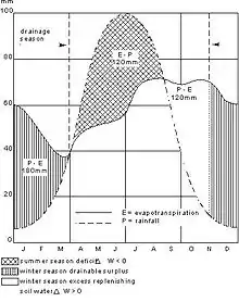 Se da un ejemplo de las características climáticas de Holanda (véase la figura) y los requisitos de drenaje y riego que resultan de estos.