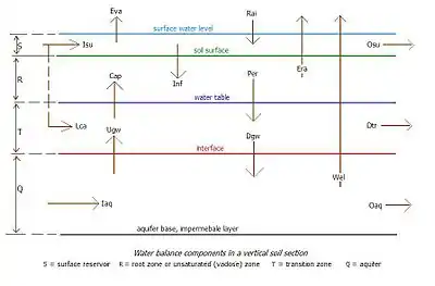 Los componentes del balance de agua se dejan agrupar conforme a las zonas en una sección vertical en el suelo constituyendo reservorios con flujo de entrada y de salida y almacenaje del agua:[2]