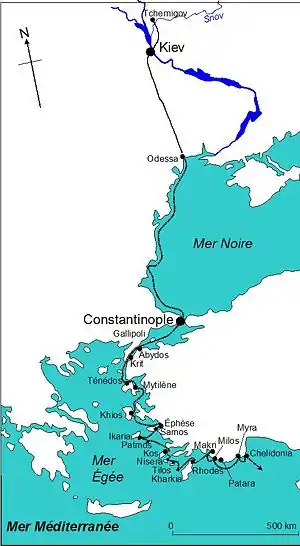 En su peregrinación por Tierra santa, Daniel se dirigió a Constantinopla, donde embarcó para Jaffa, pasando antes por Éfeso, Chipre y otros enclaves de su ruta marítima. Puede datarse con certeza el momento de su peregrinación porque hace abiertamente referencia al Gran-Príncipe de la Rus de Kiev Sviatopolk II Iziaslávich .