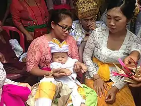 Sus creencias establecen que un bebé recién nacido representa el alma de un antepasado y se le considera un dios durante los primeros 42 días de su vida. Sin embargo, la madre se considera impura y no se le permite participar en ninguna actividad religiosa durante este período. Un bebé no debe tocar la tierra impura hasta que tenga 105 días, la mitad de la celebración de su primer cumpleaños según el calendario balinés pawukon de 210 días. Una vez que el niño alcanza la pubertad, los seis dientes caninos superiores se liman hasta que estén parejos.[37][38]