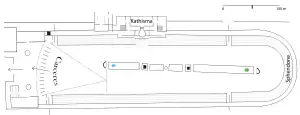 La pista de carreras tenía forma de U, y el Kathisma (el palco del emperador) estaba situado en el extremo este de la pista. Al Kathisma se podía acceder directamente desde el Gran Palacio a través de un pasillo que solo el emperador y otros miembros de la familia imperial podían utilizar. Sobre las casillas del hipódromo había cuatro estatuas de caballos construidos en bronce representando una quadriga, colocadas en el extremo norte. Estos cuatro caballos de bronce, llamados actualmente Caballos de San Marcos, fueron saqueados durante la Cuarta Cruzada en 1204 y colocados en la fachada de la Basílica de San Marcos, en Venecia. La pista fue decorada con otras estatuas de bronce de caballos y aurigas famosos, de las cuales ninguna sobrevive.
