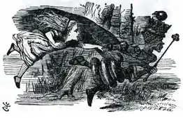 - Alicia, que es tomada de la mano por la Reina para que corran juntas, se asombra mucho al ver que, aunque corre lo más rápido que puede, sus alrededores no parecen cambiar: