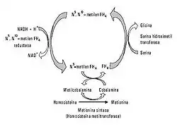 Se añade un grupo metilo a la homocisteína para formar metionina mediante dos rutas metabólicas independientes, en las que participan respectivamente las enzimas 5-metil-tetrahidrofolato-homocisteína S-metiltransferasa y la betaína-homocisteína metiltransferasa.